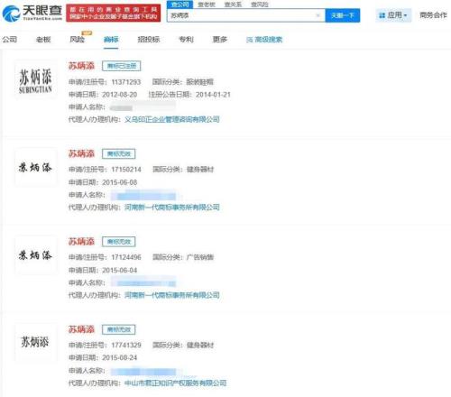 值得注意的是,已有“速炳添”“蘇餅天”“酥餅天”“酥餅添”多個(gè)蘇炳添諧音商標(biāo)注冊(cè)成功。