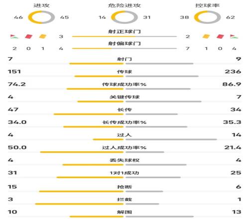 加拉塔薩雷vs紅軍半場(chǎng)數(shù)據(jù):紅軍控球率62%、射門79