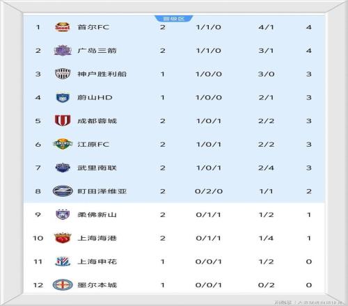 排名榜首的是首爾FC,2戰(zhàn)1勝1負(fù)積4分,排名第二的是廣島三箭,同樣積4分;