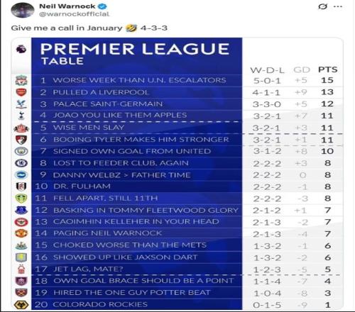 雷速體育10月2報道 76歲的傳奇救火教練尼爾·沃諾克通過社媒(X)發(fā)布一份動態(tài),對英超各隊的近況進(jìn)行了調(diào)侃。他還用“一月份給我電話”來開玩笑,表示如果曼聯(lián)解雇阿莫林,他會復(fù)出執(zhí)教紅魔。