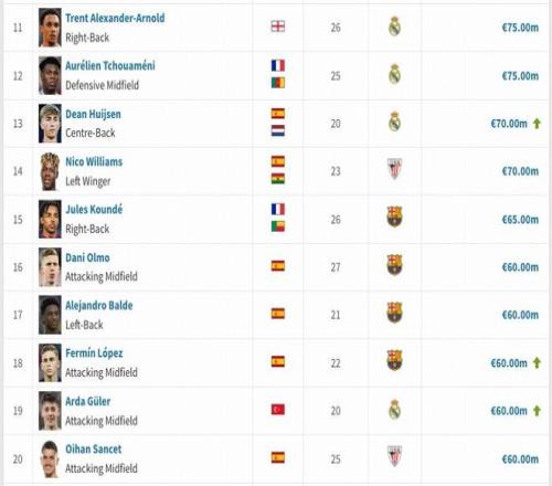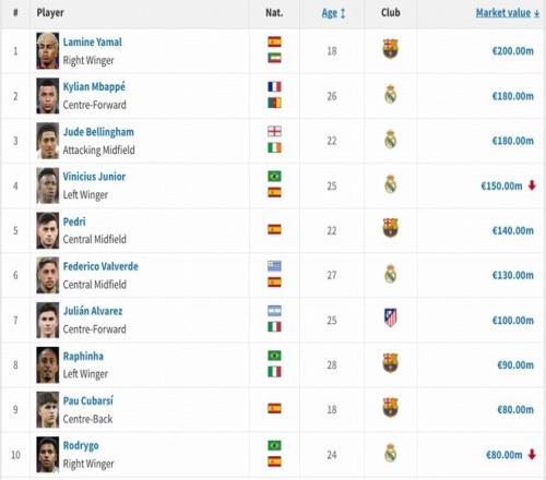 德國轉(zhuǎn)會市場公布最新一期身價(jià),西甲成為五大聯(lián)賽中首個(gè)更新的聯(lián)賽。前三名亞馬爾、姆巴佩、貝林厄姆身價(jià)維持不變,維尼修斯身價(jià)下跌2000萬歐,來到1.5億歐。