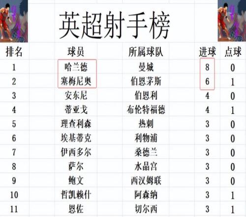 射手榜方面,6輪打入8球的哈蘭德高居榜首,塞梅尼奧今天2射一傳獨(dú)造3球,2球之差緊追哈蘭德,6球獨(dú)居第2。安東尼,蒂亞戈4球并列第3。薩爾,鮑文,哲凱賴什,?;倏?,理查利森等人3球剛好擠入前十。