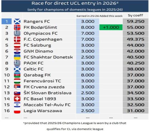但挪威超級(jí)聯(lián)賽冠軍直通歐冠的名額僅適用于博德閃耀。即使維京或莫爾德贏得了聯(lián)賽冠軍,他們?nèi)匀恍枰獏⒓淤Y格賽,因?yàn)榻刂聊壳盀橹?,他們的有關(guān)系數(shù)要低得多。目前博德閃耀在少賽一輪的情況下,落后榜首的維京1分。