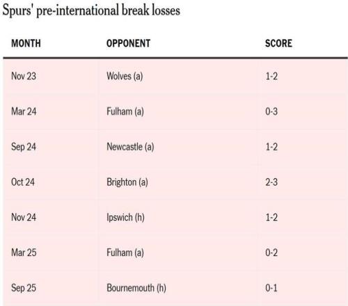 更令球迷不安的是,弗蘭克似乎繼承了前任波斯特科格魯?shù)囊欢巍肮之惸е洹保簱?jù)The Athletic統(tǒng)計(jì),在國(guó)際比賽日前的最后一輪,熱刺總是輸球。從2023年11月客場(chǎng)1-2不敵狼隊(duì)開(kāi)始,到上個(gè)月主場(chǎng)0-1輸給伯恩茅斯,熱刺已經(jīng)連續(xù)七次在國(guó)家隊(duì)比賽前吞下失利。