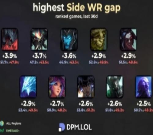 電競(jìng)體育10月4報(bào)道 外網(wǎng)數(shù)據(jù)統(tǒng)計(jì)媒體DPM.LOL分享了紅藍(lán)方勝率差距最大英雄榜單,具體如下: