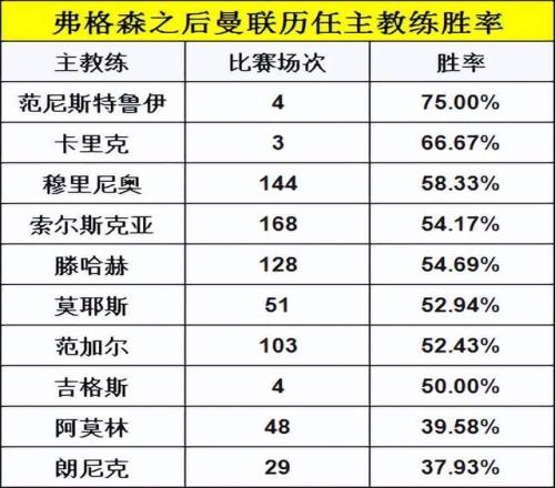 阿莫林于去年11月接替滕哈赫成為曼聯(lián)主帥,至今在所有比賽中勝率僅為39.58%,僅略高于曾擔任臨時主帥的朗尼克?;仡櫤蟾ジ裆瓡r代,無論是范加爾還是莫耶斯,雖也步履維艱,勝率仍都超過50%。即便是曾被質(zhì)疑戰(zhàn)術深度索爾斯克亞,其執(zhí)教三年間的勝率也達到54.17%,略低于滕哈赫的54.69%。此外,滕哈赫任內(nèi)還贏得了卡拉寶杯與足總杯兩項國內(nèi)錦標,為近年曼聯(lián)難得的亮點。