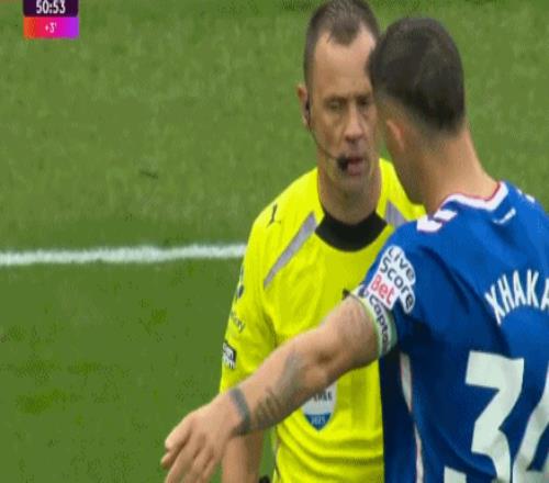 在主裁判宣布自己的決定之后,扎卡被激怒,對(duì)著主裁判怒吼。上半場(chǎng)結(jié)束之后,休姆也再次走到主裁判身邊質(zhì)疑這次判罰。