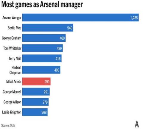 在阿森納歷任主帥執(zhí)教時長排行榜上,阿爾特塔目前位列第七。不難想象他的排名還能再上升幾位。再給他幾年時間,他將接近超越俱樂部的標(biāo)志性主帥赫伯特-查普曼,后者的雕像就矗立在俱樂部體育場著名的大鐘下。