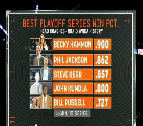 其中,王牌現(xiàn)任主教練貝基·哈蒙以90%的勝率位居榜首。 其余四位分別是: