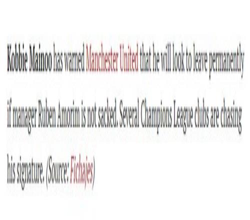 人們很難想象梅諾會有機(jī)會在下輪做客安菲爾德的英超「雙紅會」里首發(fā),預(yù)計(jì)他將繼續(xù)板凳坐穿。西班牙「Fichajes轉(zhuǎn)會網(wǎng)」稱,梅諾已經(jīng)向曼聯(lián)發(fā)出最后通牒,表示如果阿莫林沒有下課,他將永久轉(zhuǎn)會離隊(duì)。
