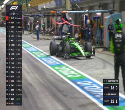 第十四圈:博托萊托和角田進(jìn)站,索伯賽車更換發(fā)車階段和斯托爾碰撞受損的前翼