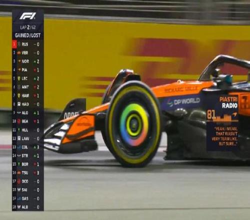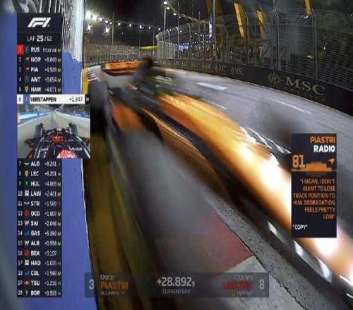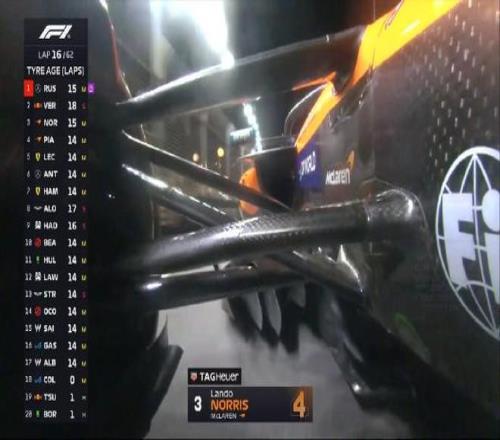 第一圈:諾里斯升至第3,但在和皮亞斯特里的爭(zhēng)奪過(guò)程中,諾里斯碰到維斯塔潘,前翼端板受損