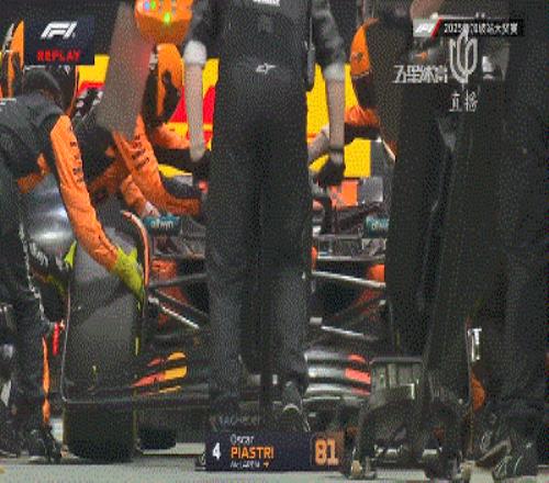 第27圈,諾里斯進站后維斯塔潘順利回到第2并獲得了近4秒的優(yōu)勢。隨后一圈,皮亞斯特里進站,右前和左后兩側(cè)輪胎在換胎時都出現(xiàn)了問題,導(dǎo)致皮亞斯特里進站耗時達到5.2秒。