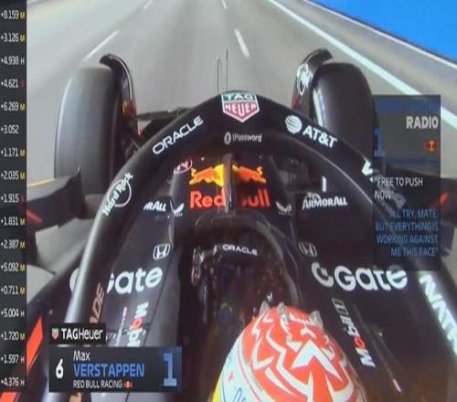 第23圈,維斯塔潘做出了最快單圈,車隊讓他全速前進,但他表示自己會竭盡所能可感覺所有的事都在和他做對(此前賽車遇到了降檔問題)。此時他和諾里斯的差距在20秒左右,若諾里斯進站他依舊將大概率回到諾里斯身前。
