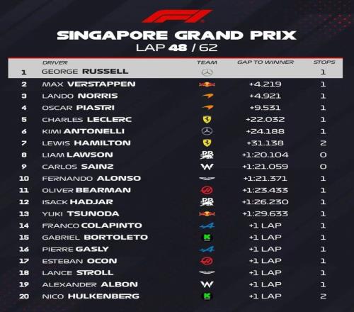 北京時間10月5日晚,2025賽季F1結(jié)束了新加坡站的正賽爭奪。最終,拉塞爾第一個沖過終點實現(xiàn)Pole To Win!同時,這也是新加坡站近6年來的第6位冠軍!維斯塔潘強勢守住第二獲得亞軍。
