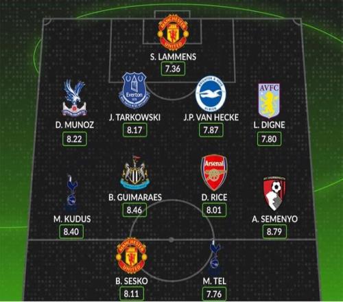 外媒評(píng)英超第7輪最佳陣容:曼聯(lián)、熱刺兩人入選,賴斯在列