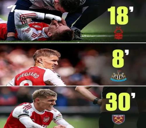 本輪與西漢姆聯(lián)的比賽,厄德高僅踢了30分鐘便因傷退場。賽后,阿森納官宣厄德高左膝內(nèi)側(cè)副韌帶受傷,回歸時間未定。過去一年,厄德高可謂是“傷痕累累”,本賽季尤甚。統(tǒng)計數(shù)據(jù)顯示:厄德高成為英超史上首位連續(xù)三場聯(lián)賽首發(fā)都在半場前因傷被換下的球員。