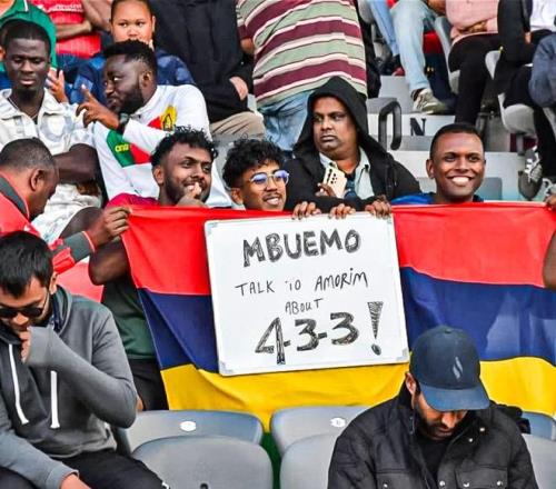 這場比賽的看臺上,3名毛里求斯球迷舉起毛里求斯的國旗,同時還用一個白板寫道:“姆伯莫,跟阿莫林聊聊4-3-3吧!”