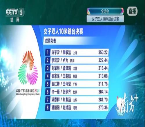 11月6日晚,女子雙人10米跳臺決賽在廣東省奧體中心游泳跳水館舉行。經(jīng)過激烈角逐,上海組合陳芋汐/掌敏潔憑借出色的發(fā)揮奪得冠軍,四川組合李蕊汐/盧為獲得銀牌,江蘇組合劉軍熙/孟澤瑞獲得銅牌,廣東組合全紅嬋/王偉瑩獲得第五。