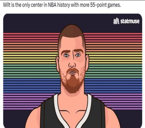 第三,在NBA歷史上,只有威爾特-張伯倫比約基奇擁有單場(chǎng)55分場(chǎng)次最多的中鋒。