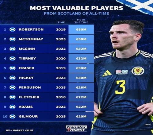 德轉(zhuǎn)列蘇格蘭球員歷史身價前10:羅伯遜8000萬歐第1,小麥第2