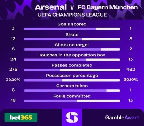 歐冠聯(lián)賽階段第5輪迎來一場(chǎng)焦點(diǎn)大戰(zhàn),分列積分榜前兩名的拜仁慕尼黑和阿森納狹路相逢。兩隊(duì)均在聯(lián)賽中領(lǐng)跑且近期狀態(tài)正佳。上半場(chǎng)于里恩·廷伯在角球中頭球破門,倫納特·卡爾扳平比分。下半場(chǎng)馬杜埃凱和馬丁內(nèi)利兩名替補(bǔ)出場(chǎng)的球員先后建功,阿森納主場(chǎng)3比1送給拜仁賽季首敗,以全勝的傲人戰(zhàn)績(jī)獨(dú)自領(lǐng)跑積分榜。