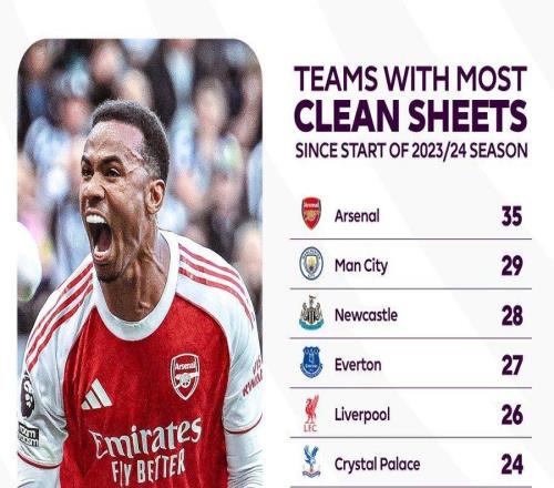 2324賽季以來英超零封對(duì)手次數(shù)最多的球隊(duì):阿森納第一